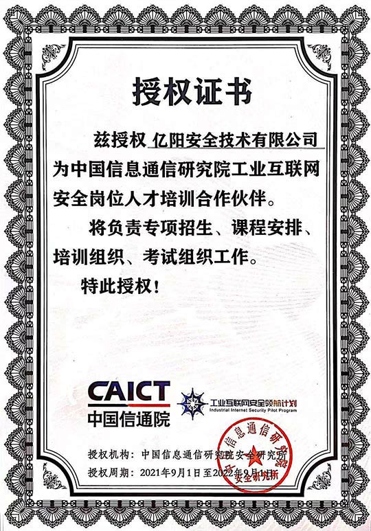 近日,億陽安全技術(shù)有限公司(億陽信通股份有限公司全資子公司)獲得了由中國信息通信研究院頒發(fā)的“工業(yè)互聯(lián)網(wǎng)安全‘領(lǐng)航計(jì)劃’崗位人才培訓(xùn)合作伙伴”授權(quán),將負(fù)責(zé)專項(xiàng)招生、課程安排、培訓(xùn)組織、考試組織工作。