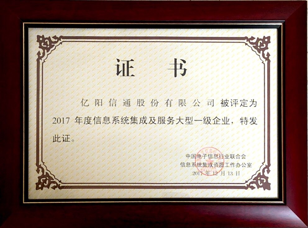 2017年12月13日, 2017中國(guó)信息系統(tǒng)集成及服務(wù)行業(yè)年會(huì)在北京召開。中國(guó)電子信息行業(yè)聯(lián)合會(huì)在會(huì)上公布了“2017年信息系統(tǒng)集成及服務(wù)大型一級(jí)企業(yè)”證書獲獎(jiǎng)單位名單并頒發(fā)證書,億陽信通股份有限公司名列其中!