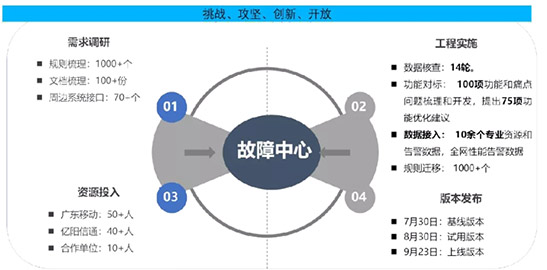 原有故障管理系統(tǒng)經(jīng)過 10 余年的建設(shè)和沉淀,目前管理了 10 余大專業(yè),100 多類設(shè)備,近 5000 萬個(gè)資源對(duì)象,涉及周邊系統(tǒng) 70 余套,1000 余個(gè)接口,關(guān)系到全省網(wǎng)絡(luò)設(shè)備的監(jiān)控和派單。本次上線涉及到全新架構(gòu)開發(fā),數(shù)據(jù)接入、清洗和遷移,微服務(wù)改造、上層應(yīng)用功能開發(fā)和改造等諸多工作,是對(duì)新架構(gòu),業(yè)務(wù)熟悉程度,工程建設(shè)管理等巨大考驗(yàn),需要精心準(zhǔn)備,超前思考,巨量投入。為此,廣東移動(dòng)和億陽信通組成聯(lián)合項(xiàng)目團(tuán)隊(duì),廣東移動(dòng)網(wǎng)絡(luò)管理中心孫劍駿總親自指導(dǎo),林綱總攜網(wǎng)管系統(tǒng)室和網(wǎng)絡(luò)監(jiān)控室主建,各單位協(xié)作, 經(jīng)過近十個(gè)月的努力奮斗, 廣東移動(dòng)故障中心完成并行上線。